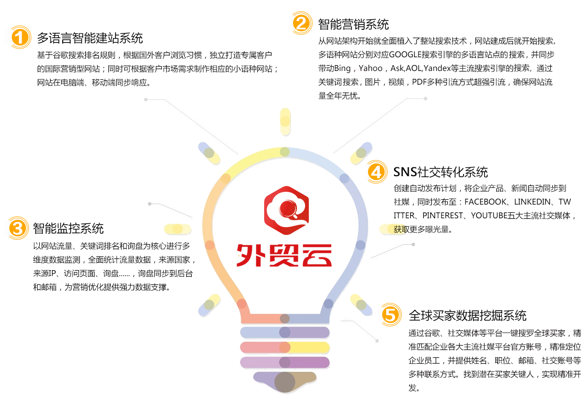 外贸云产品是基于易商互联超过10年的外贸营销和SEO技术优势,实现关键词裂 变,符合各大搜索引擎收录并排名,让您在众多竞争对手中脱颖而出。